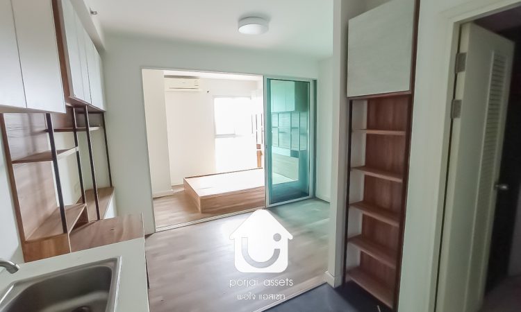 ภายในตัวห้องที่นำเสนอ เป็นห้องแบบ 1-Bedroom ขนาด 25.05 ตารางเมตร เป็นห้องระเบียงฝั่งทิศใต้ อยู่ที่ชั้น 17 บรรยากาศเงียบสงบ ไม่มีตึกสูงบดบัด ตัวแบ่งห้องออกเป็น 2 พื้นที่ใช้งาน ส่วนแรกจะเป็น pantry+ห้องนั่งเล่นและห้องน้ำ ส่วนด้านในสุดของตัวห้องจะเป็นห้องนอนและระเบียง วัสดุพื้นผิวใช้ลามิเนตลายไม้ผสมกับแกรนิตโต้ ภายในห้องมีเฟอร์นิเจอร์และเครื่องใช้ไฟฟ้าตามภาพ